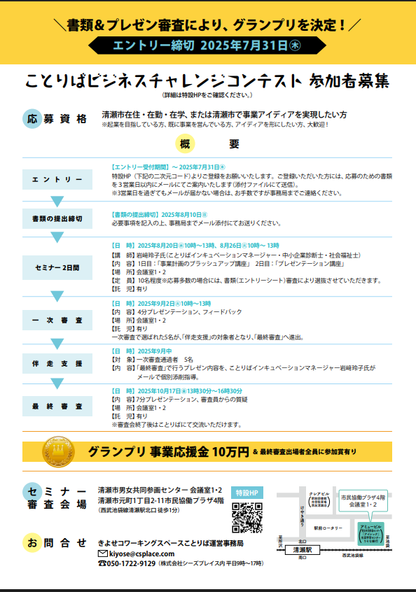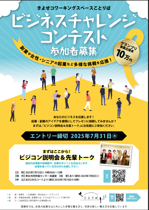 清瀬市在住・在勤・在学、または清瀬市で事業アイディアを実現したい方 ※起業を目指している方、既に事業を営んでいる方、アイディアを形にしたい方、大歓迎! |