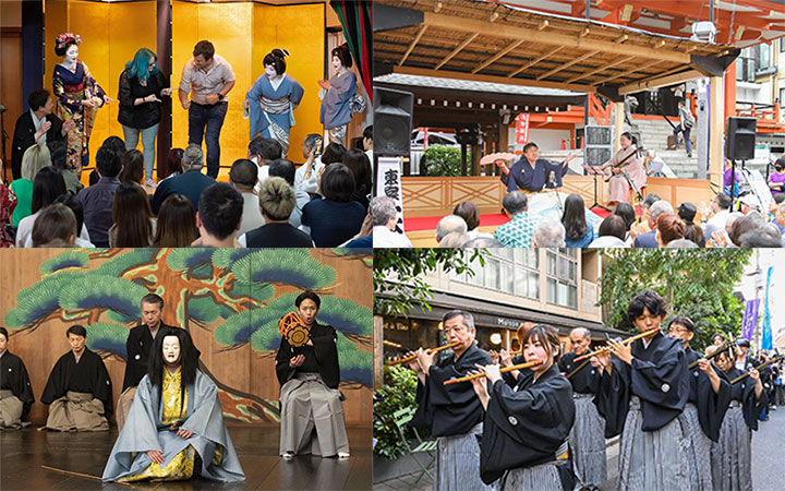 ⽯畳の路地や路上、寺社境内、そして能楽堂など、神楽坂の特徴的なスポットで、様々な伝統芸能を気軽に楽しめます。三味線や箏、尺八といった和楽器の演奏、能や日本舞踊の舞台に加えて、講談、浪曲、落語といった語りの芸も味わえます。三味線を奏でながら路地をめぐる「新内流し」や、芸者さんと一緒に楽しむ「お座敷遊び体験」など、神楽坂ならではのプログラムも人気です。さらに、⽇本の伝統楽器と異ジャンルの楽器、また伝統楽器とコンテンポラリーダンスによるコラボレーションなど、第⼀線で活躍するアーティストたちが、多様なアプローチで伝統芸能の世界へいざないます。