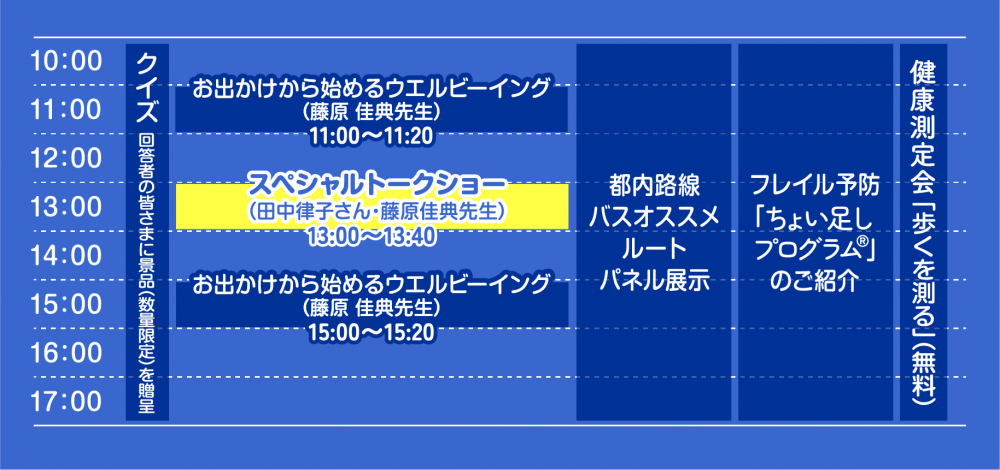 5月17日10時00分~17時00分、新宿駅西口広場で。都内路線バスなどが利用できるシルバーパスを使ったバス旅ルートを紹介。バス旅と健康をテーマとした田中律子さん(タレント)によるトークショーや社会参加につながる講演、フレイル予防の啓発など。