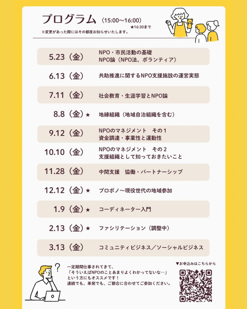 NPO・市民活動・中間支援の基礎から応用まで、幅広い知識を身につけることができる、内容充実のプログラムです。