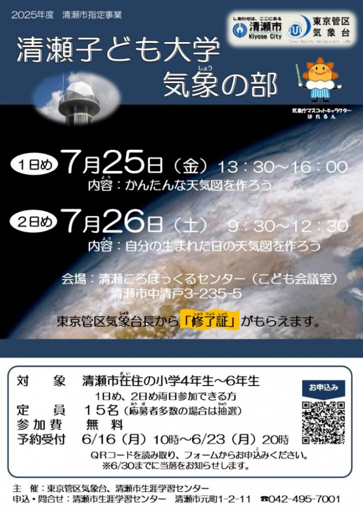 東京管区気象台の協力を得て、今年も清瀬子ども大学 気象の部の開催が決定しました。