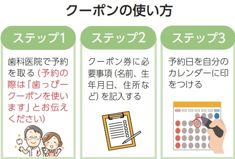 歯科医師などによる、お口の元気度チェックと個別の指導を受けられる「歯っぴークーポン(無料券)」の配布を行います。ぜひご利用ください。