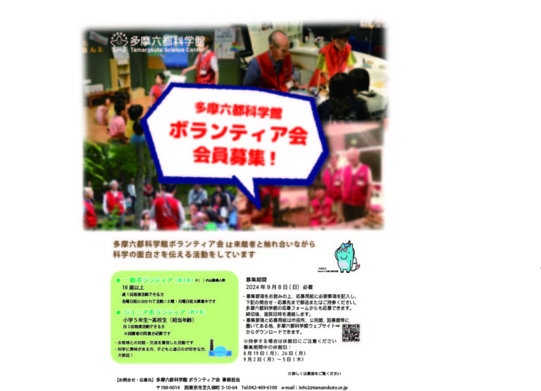 2024年度の定期募集を行います。募集要項をお読みの上、申込書に記入し、多摩六都科学館宛て、持参、郵送でご提出ください。専用フォームからも応募できます。