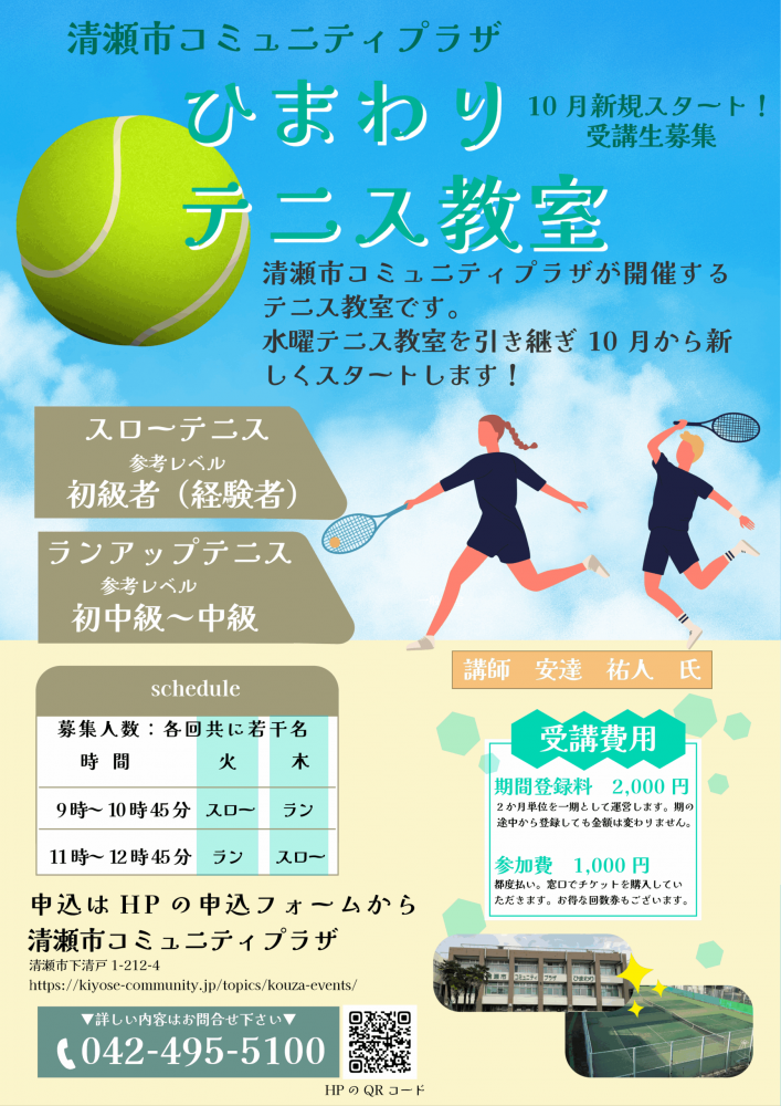 清瀬市コミュニティプラザのテニスコートで行うレッスンです。既存のひまわり水曜テニス教室から引き継ぎ、新しいコーチをお招きして10月から一新!10-11月期の新規の受講生を募集します。二つのレベルをご用意していますのでご自分のレベルにあったレッスンを受けることが出来ます。