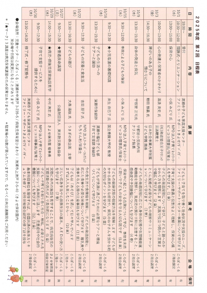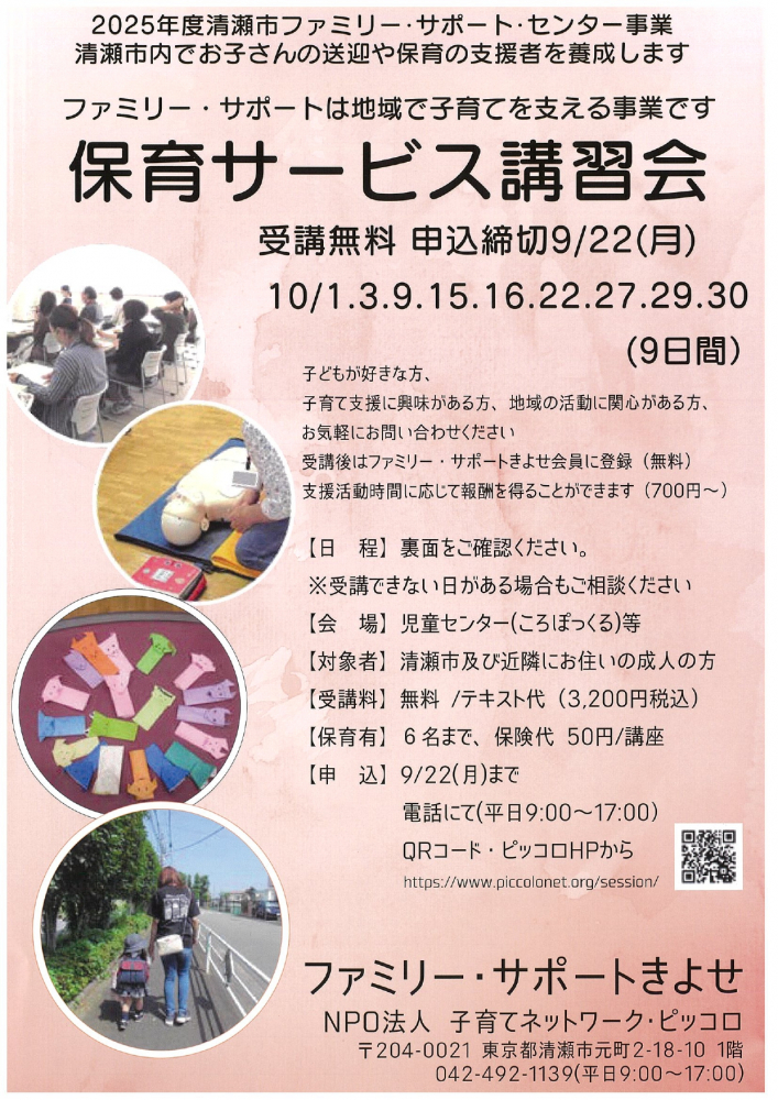 日 程令和7年10月1日(水曜日)、3日(金曜日)、9日(木曜日)、15日(水曜日)、16日(木曜日)、22日(水曜日)、27日(月曜日)、29日(水曜日)、30日(木曜日)時 間関連ファイルをご参照ください。会 場児童センター、きよせ保育園費 用3,200円(テキスト代)申 込令和7年9月22日(月曜日)までに電話または二次元バーコードから ※二次元バーコードは関連ファイルに掲載問 合ファミリー・サポートきよせ 電話:042-492-1139(電話は平日午前9時~午後5時)備 考保育あり(1コマ50円・定員6名) ★マークは保育なし。