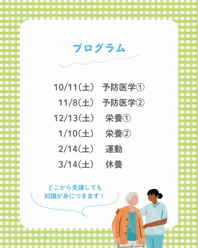 この講座では、病気や身体の変化のメカニズムと基礎知識を分かりやすく解説し、正しく理解することで、不安を自信に変える知恵を身につけます✨ いつまでも健康に生活するための基礎知識はもちろんのこと、どなたでも無理なく続けられる簡単なストレッチや運動を、体験しながら楽しく習得します♪