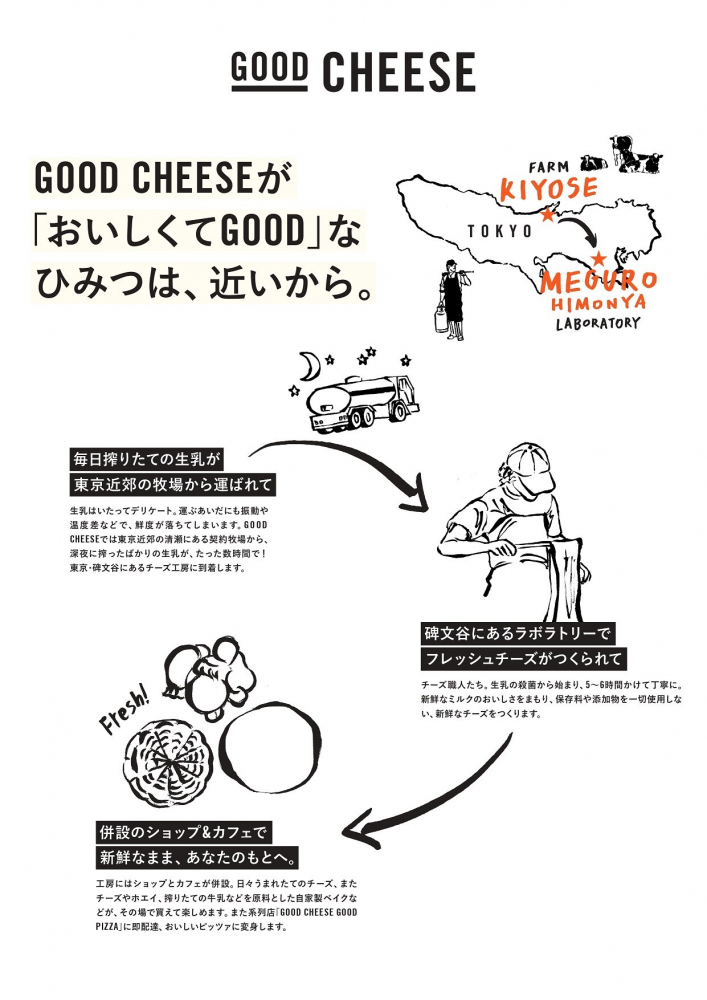 清瀬市は、農業が盛んな街として有名ですが、実は清瀬市には5軒の牧場があり都内有数の規模を誇る、都心に近い酪農地でもあります。清瀬の牧場で搾られた生乳が「東京牛乳」やチーズの原料として出荷されていますが、目黒区碑文谷にあるGOOD CHEESE LABORATORYでは、フレッシュチーズに加工され、GOOD CHEESEの運営するレストランやDEAN&DELUCAカフェなどで、提供されています。